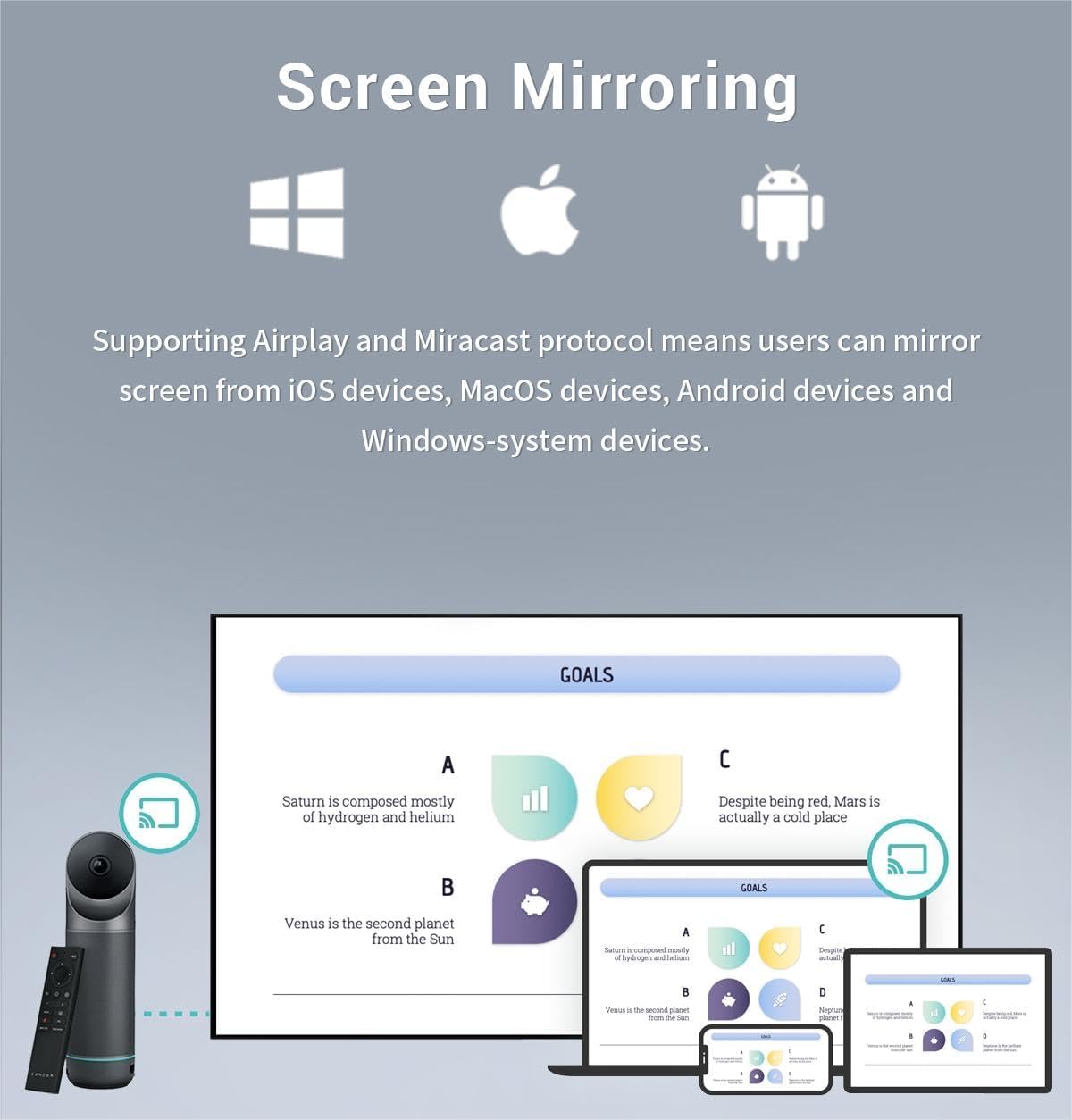 [Adapt to Any Meeting Space] – Builte-in 8*omni-directional mics and customized Hi-Fi speaker, this meeting camera captures the speaker’s voice accurately and prevents background noise from disturbing meetings