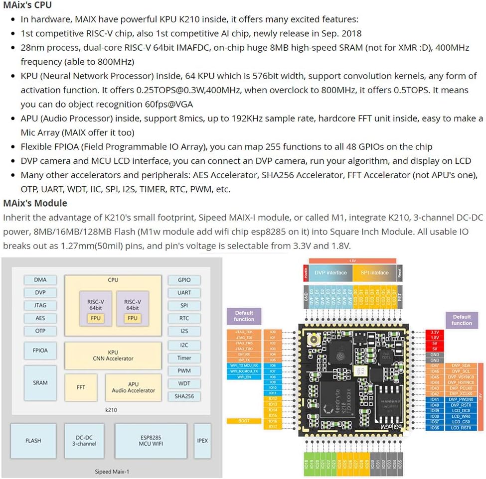 High performance and Low Power: Maix M1 Dock is based on the intelligent computing chip K210 (RISC-V Dual Core 64bit, with FPU,400Mhz-500Mhz, Neural network processor ) for AloT edge computing solution